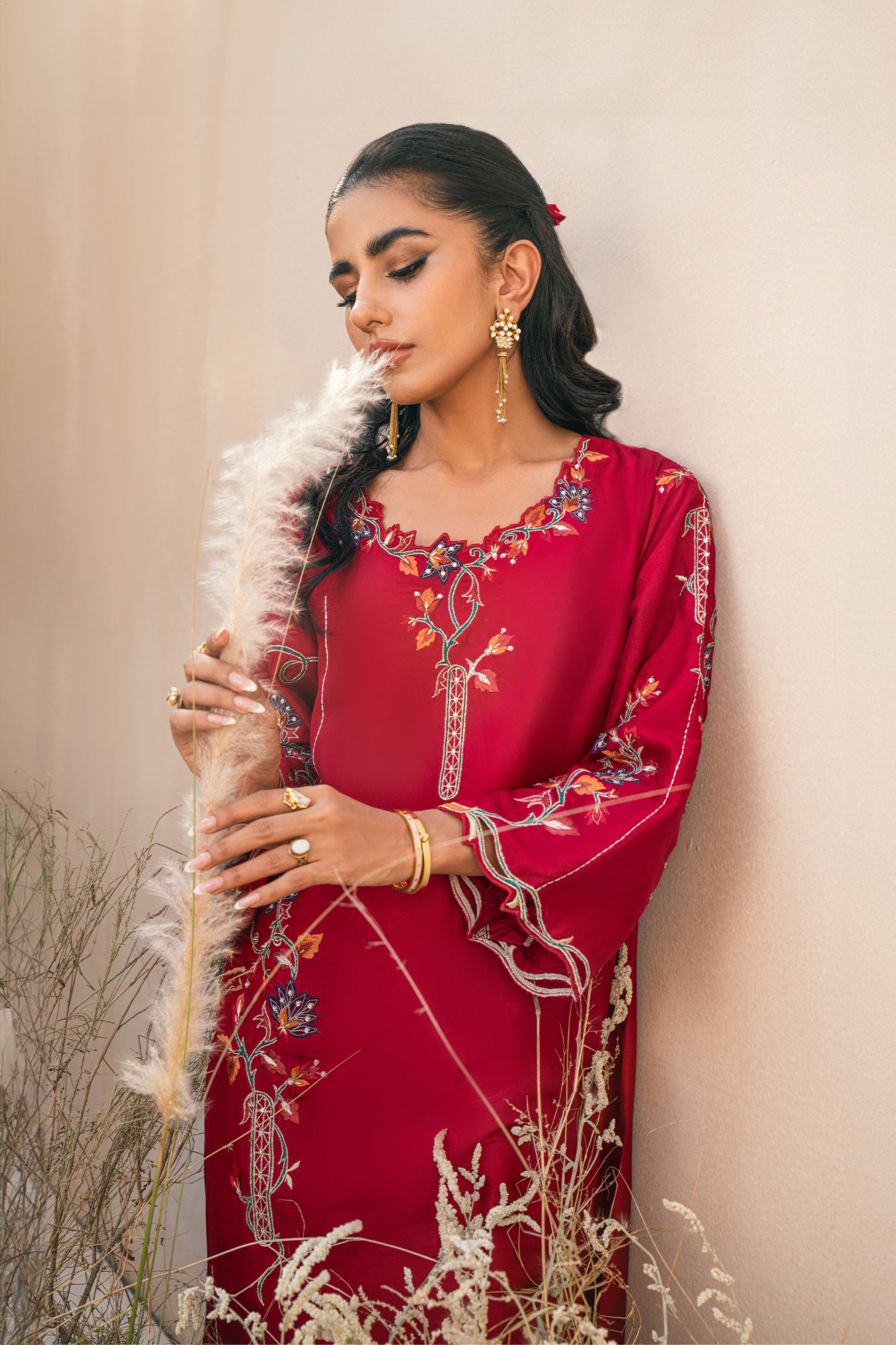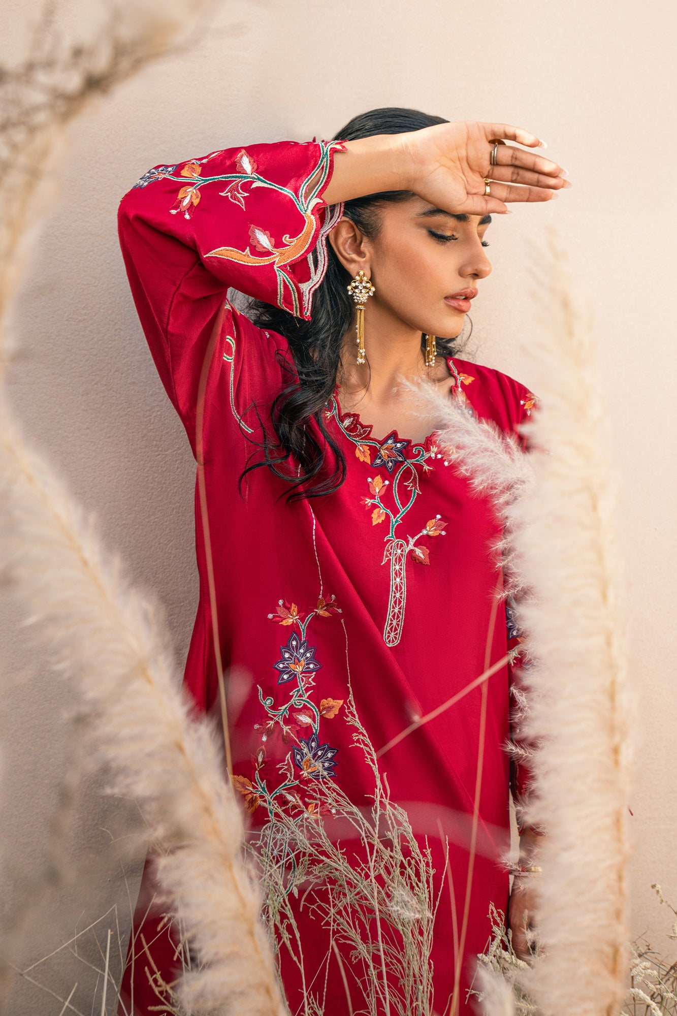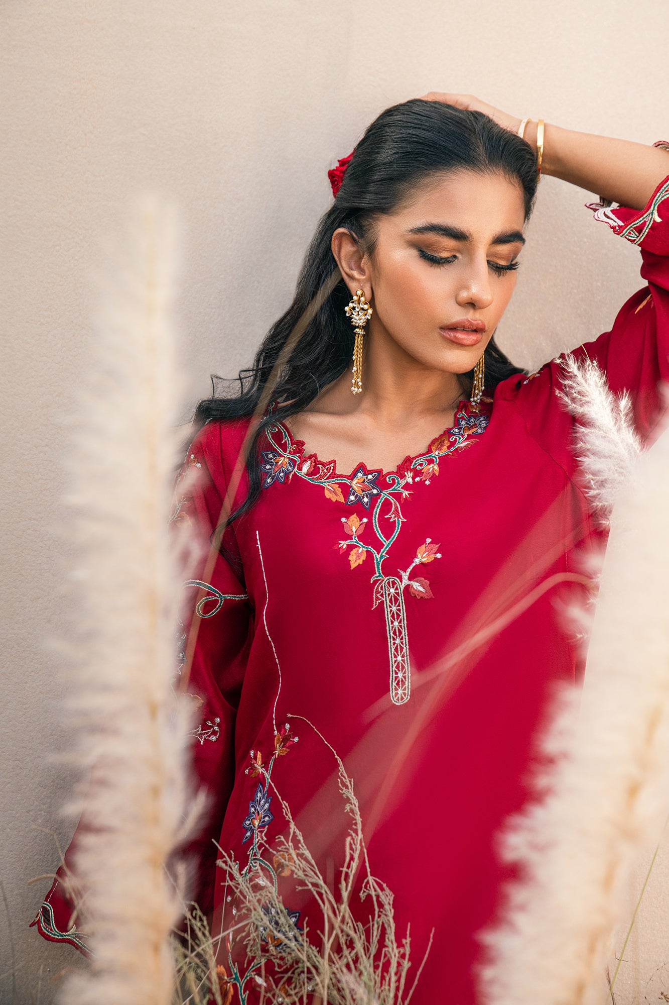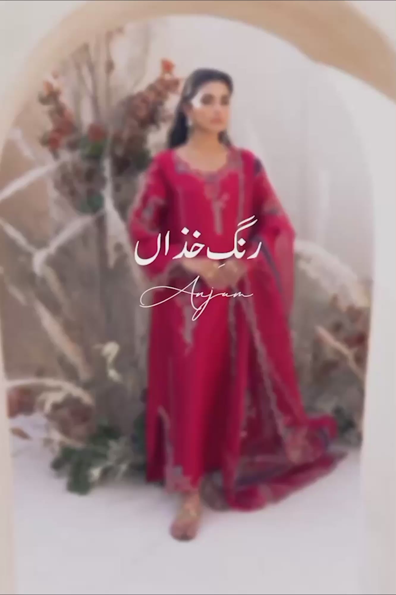 Anjum from Rang - e - Khizan speaks the language of passion and grace in Rouge. The exquisite embroidery and rich hues create an ensemble that's meant to steal hearts and create cherished memories.