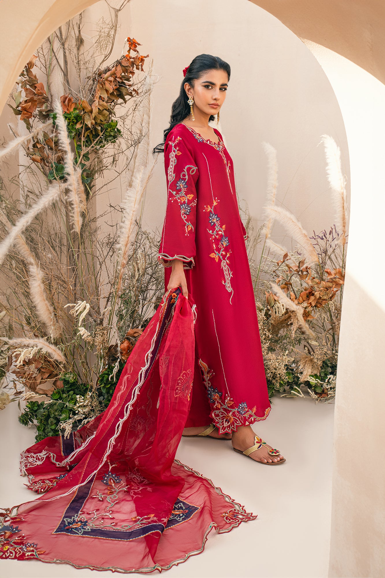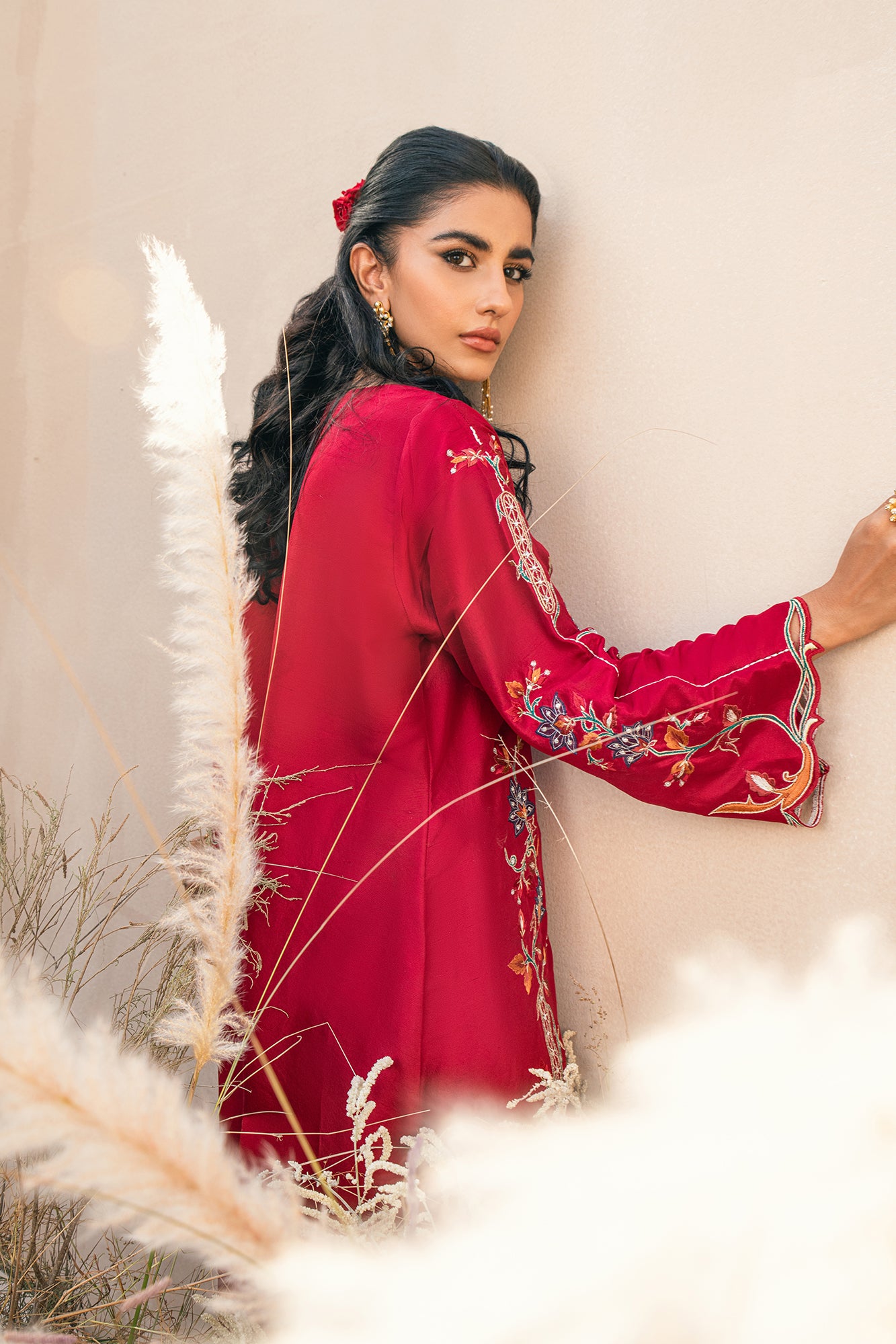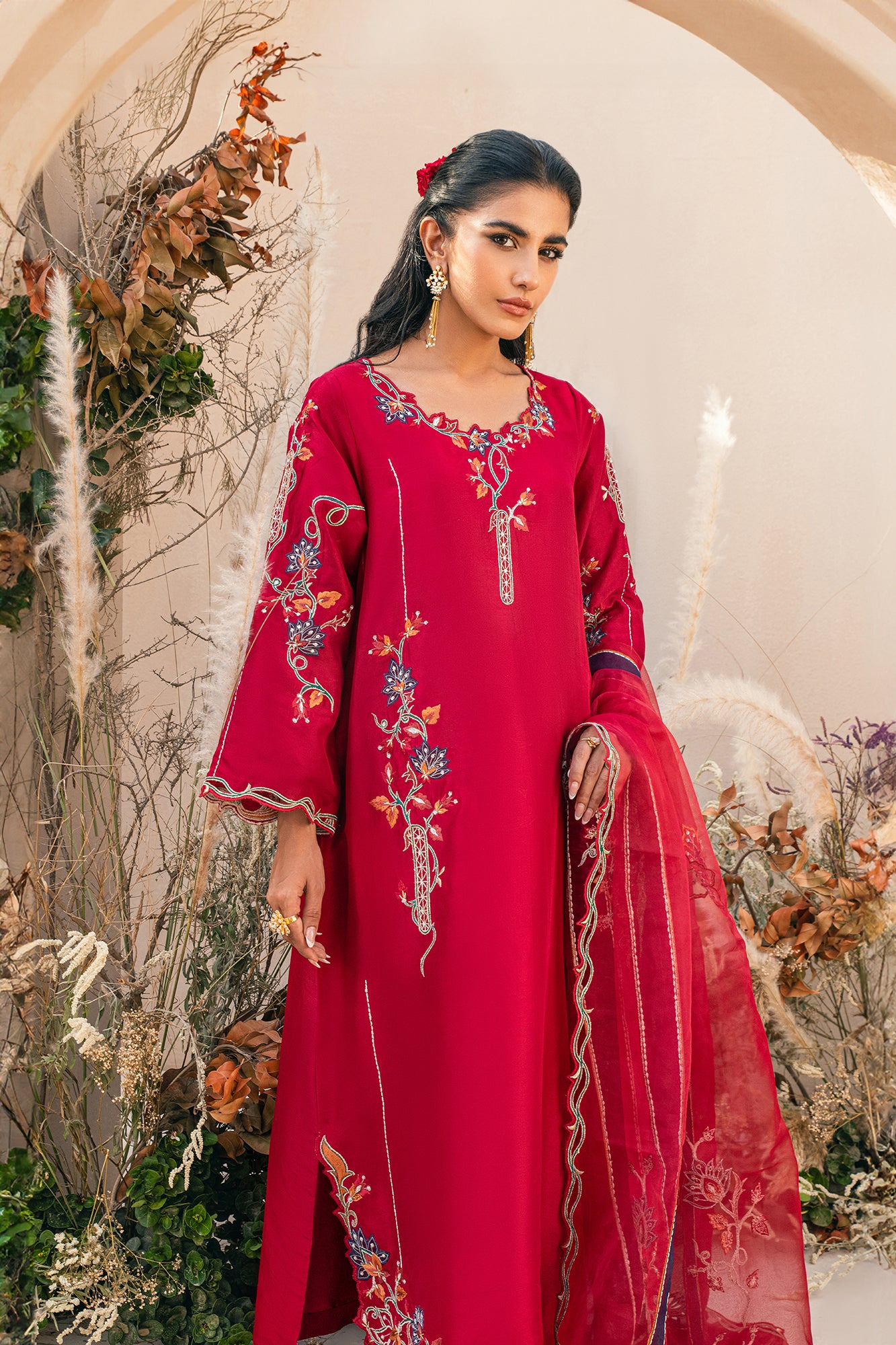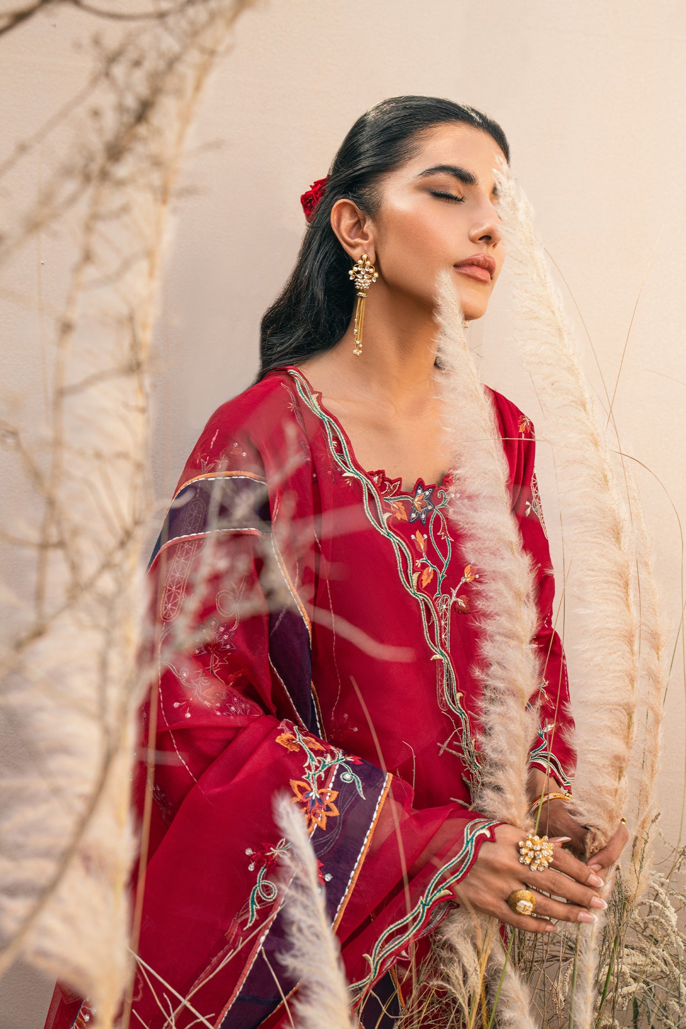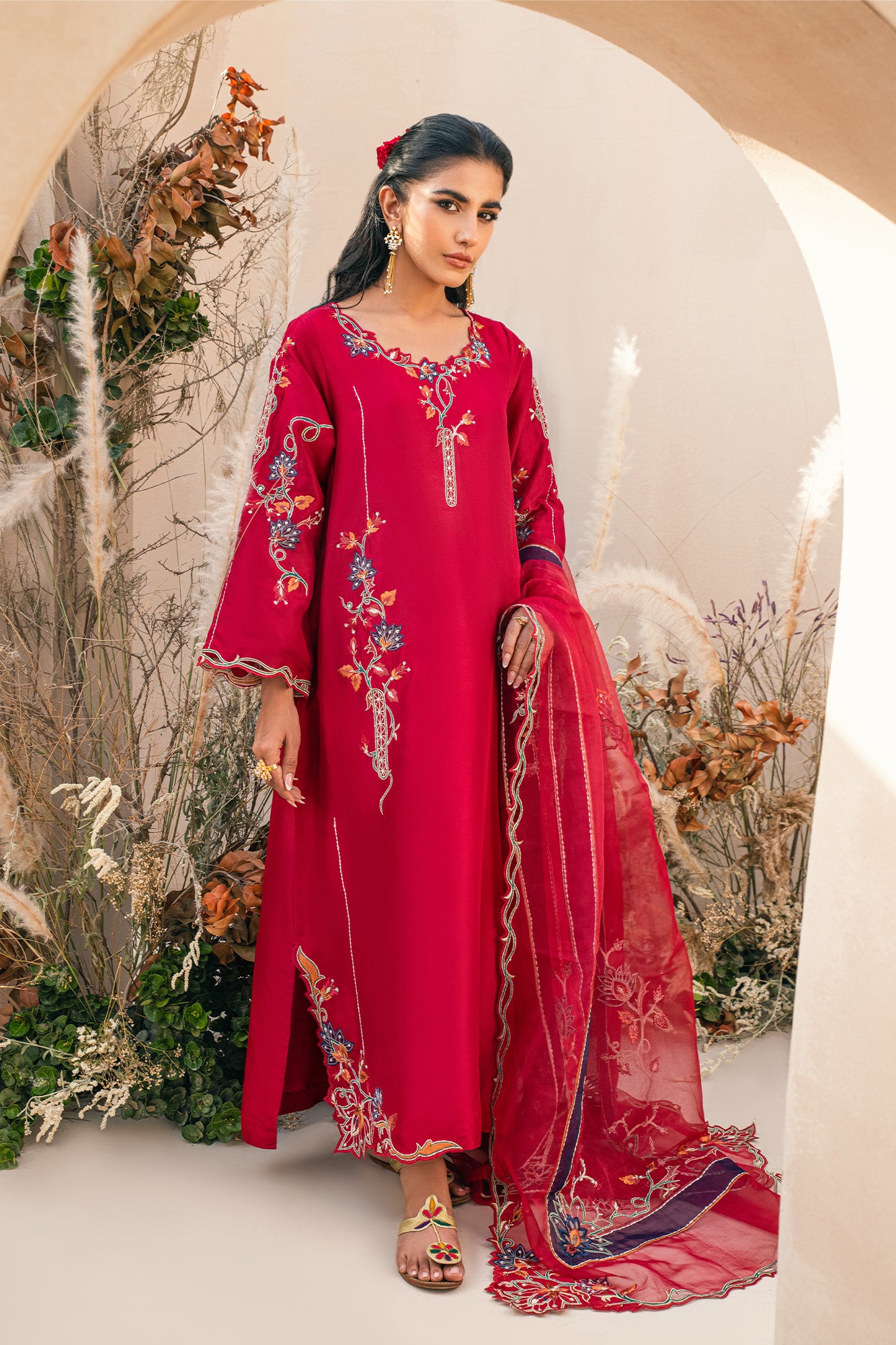 Anjum from Rang - e - Khizan speaks the language of passion and grace in Rouge. The exquisite embroidery and rich hues create an ensemble that's meant to steal hearts and create cherished memories.