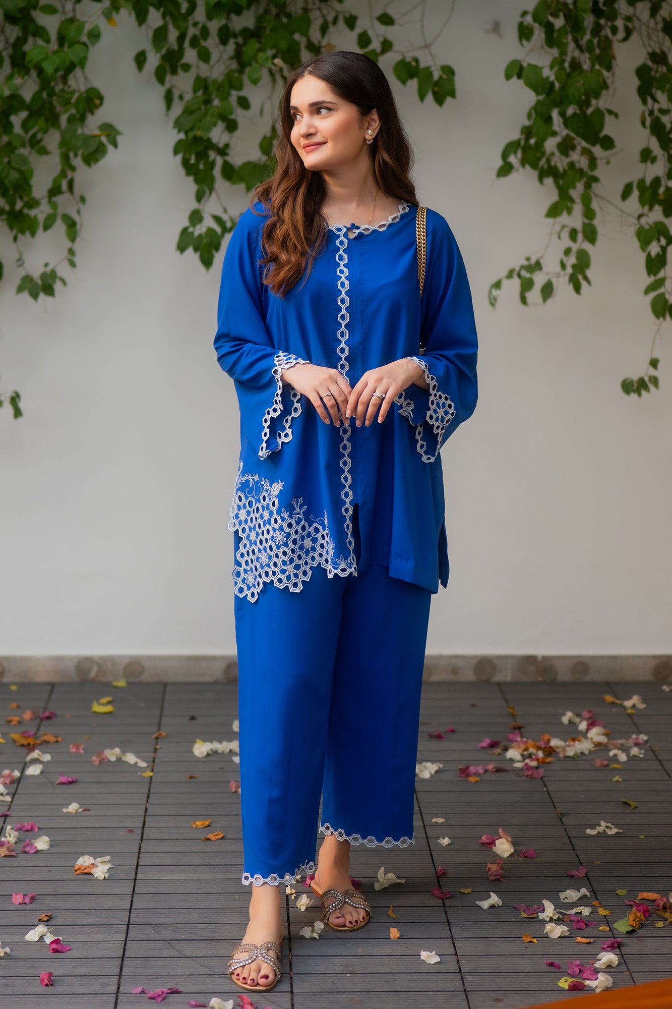 The Honeybee Design features stunning white embroidery on the shirt and sleeves hemline, that beautifully contrasts against the vibrant electric blue fabric. This intricate embroidery is a testament to showcasing a design that is modern. Paired with geometric scalloped bell bottoms.