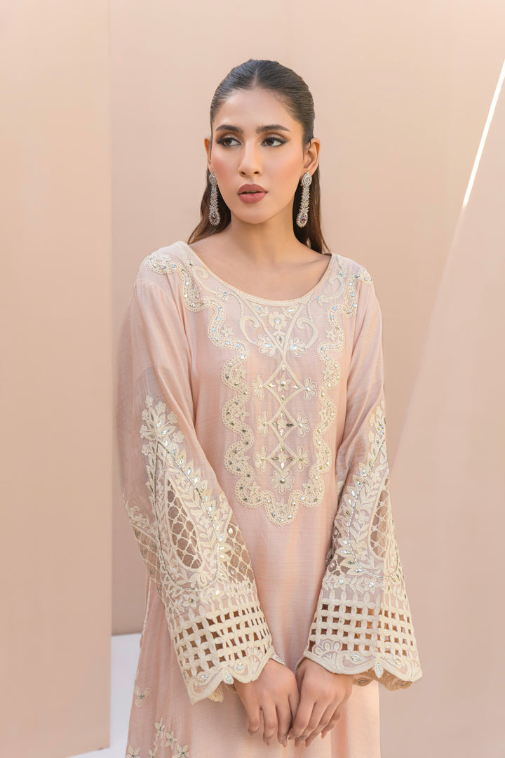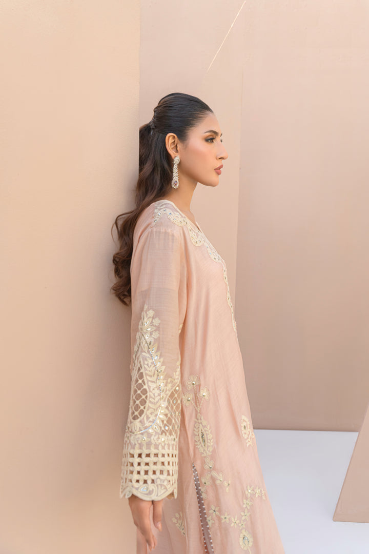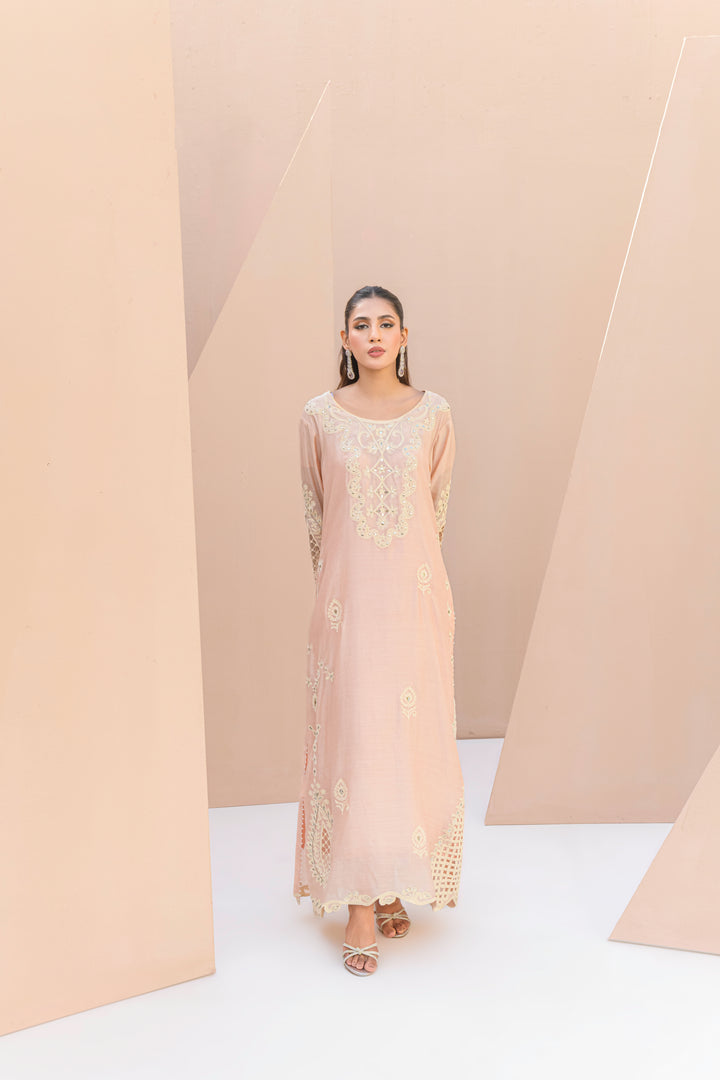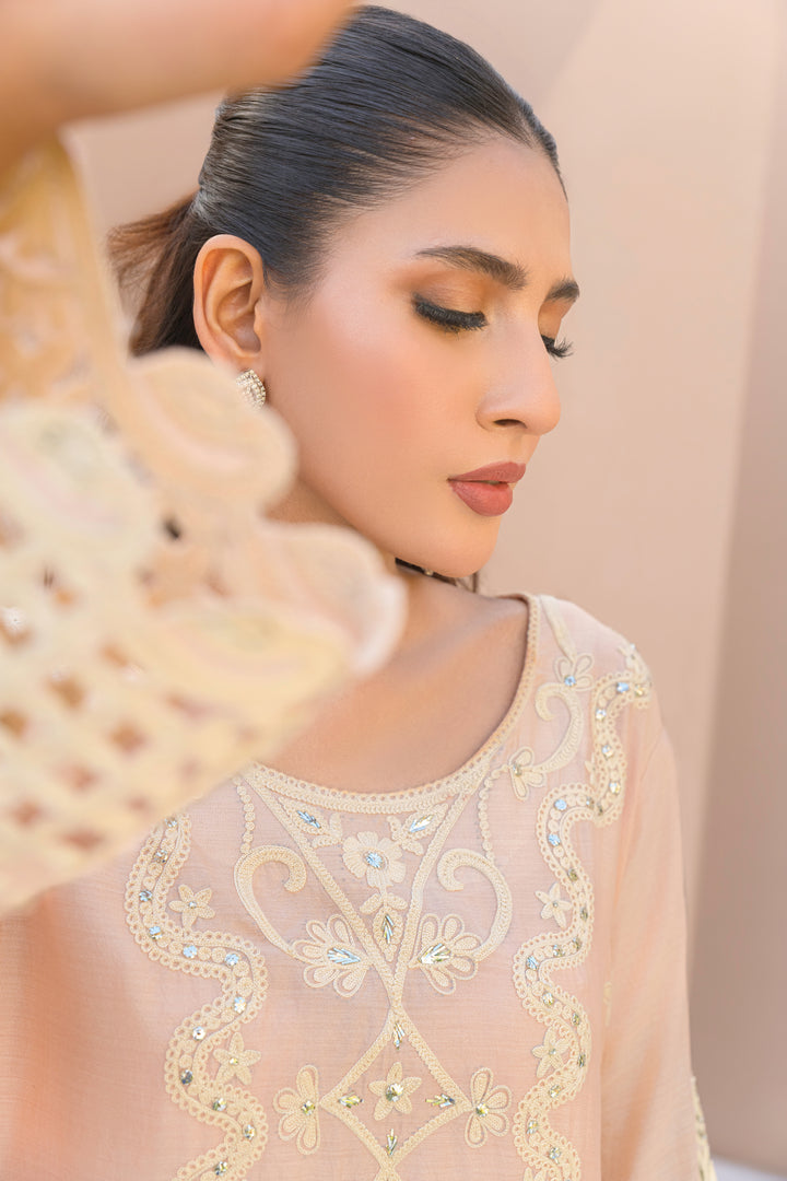 A heritage-inspired kaftan in Khaadi silk, Hunar blends rustic texture with delicate handwork. Ari embroidery and soft kamdani shimmer add richness to the natural weave.