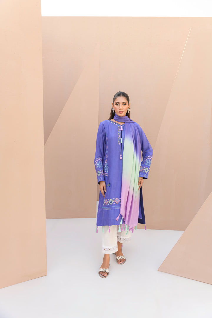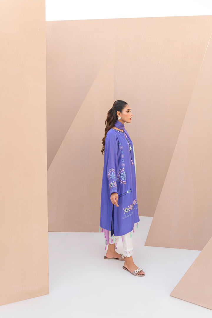Periwinkle purple Sheesha silk shirt, detailed with hand embroidery, delicate appliqué work, and tassels along the daman.Paired with a dreamy...