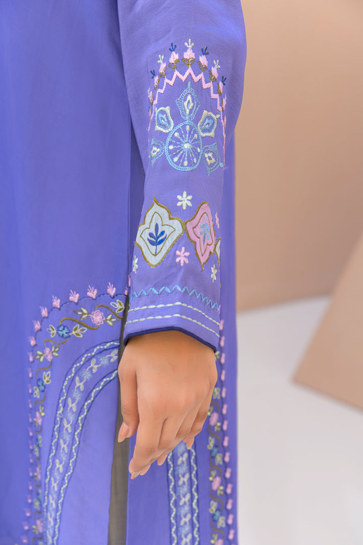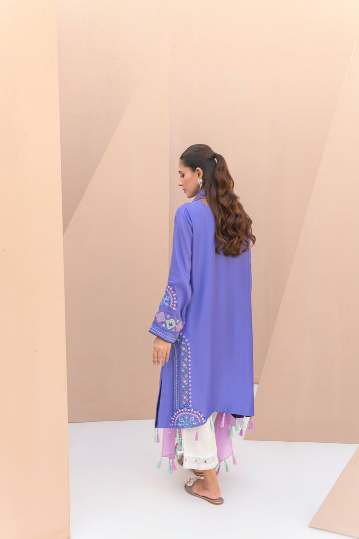 Periwinkle purple Sheesha silk shirt, detailed with hand embroidery, delicate appliqué work, and tassels along the daman.