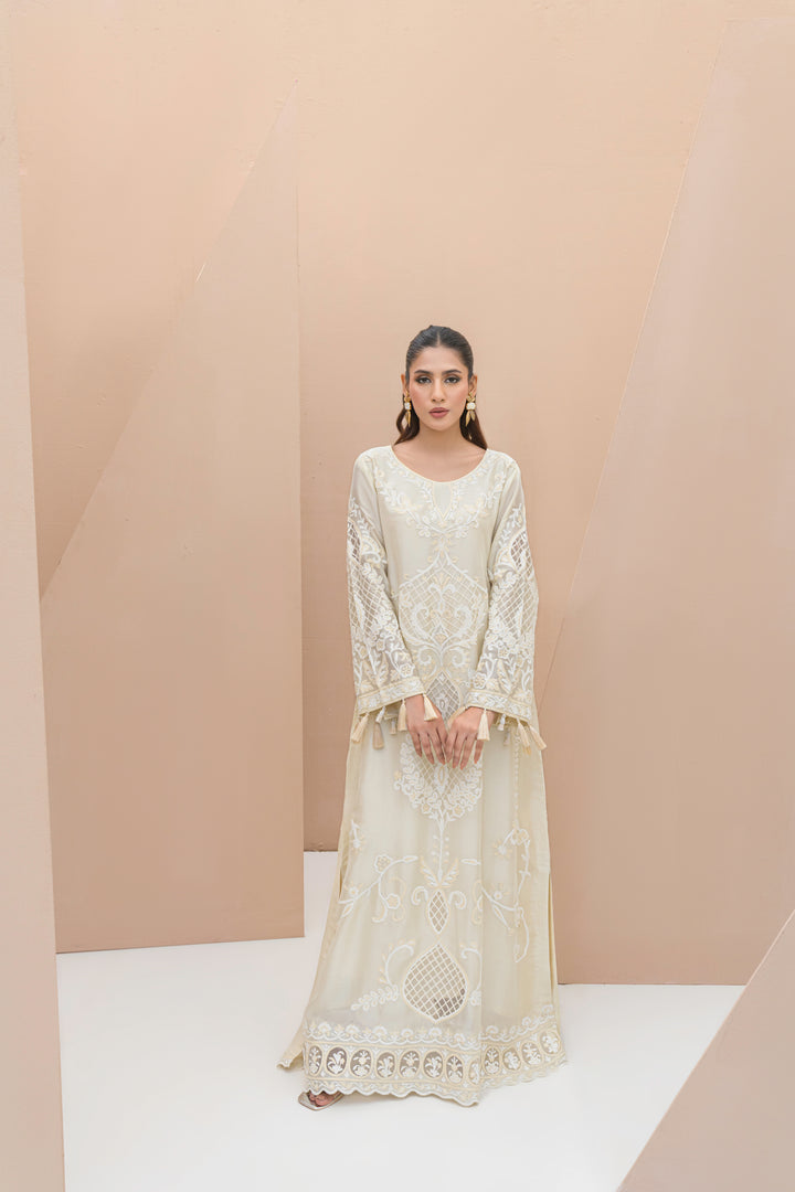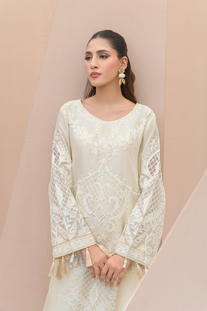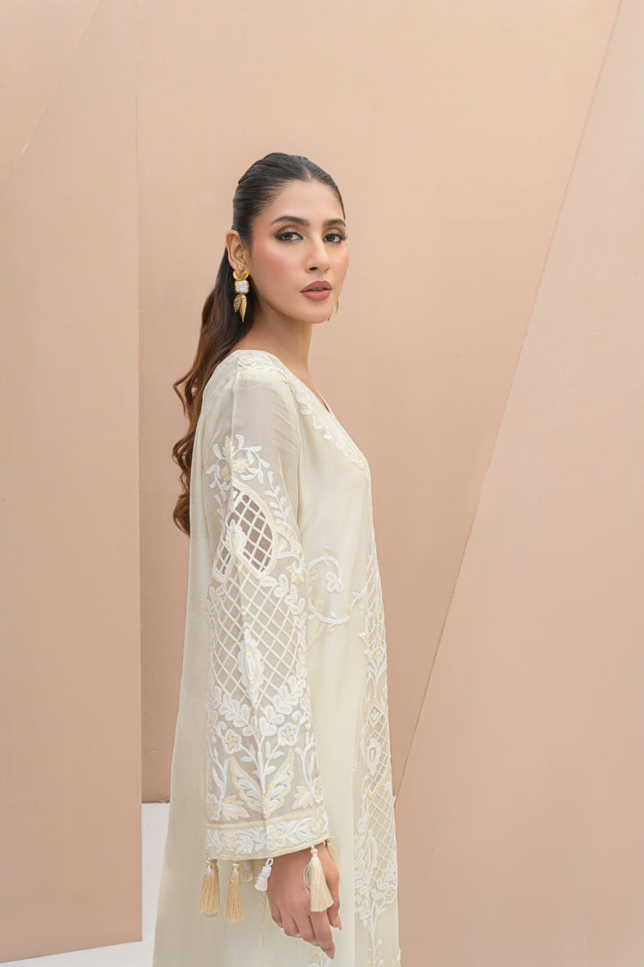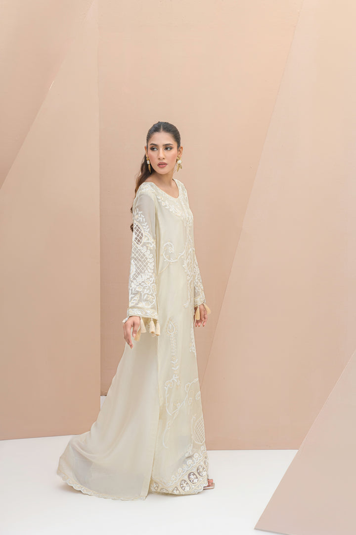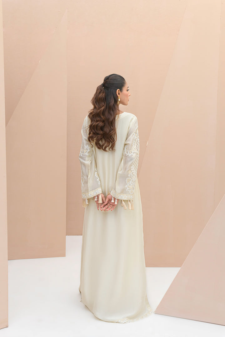 Crafted in a soft cream organza, Nazakat features all-over ari embroidery with fine border work and playful sleeve tassels. Light, elegant, and versatile.