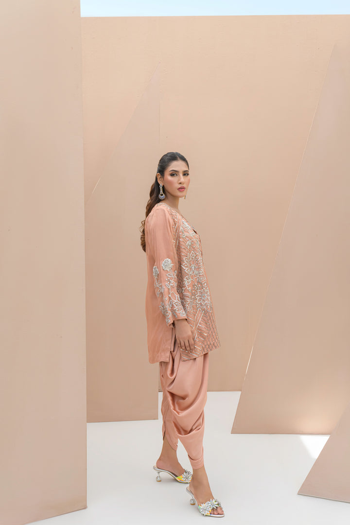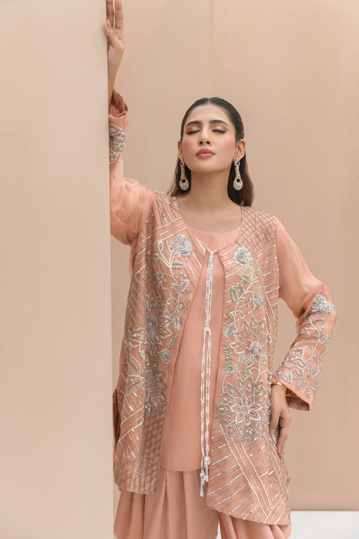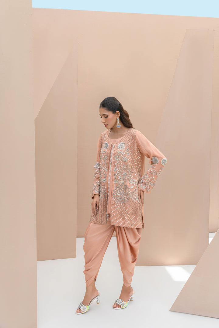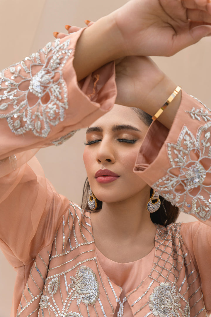 Neer is a three-piece ensemble featuring a soft pink Mesori organza jacket layered over a Sheesha silk camisole and dhoti shalwar. Delicate Mukesh and Dabka work, along with strands of pearls, create a look that’s feminine, festive, and effortlessly chic.