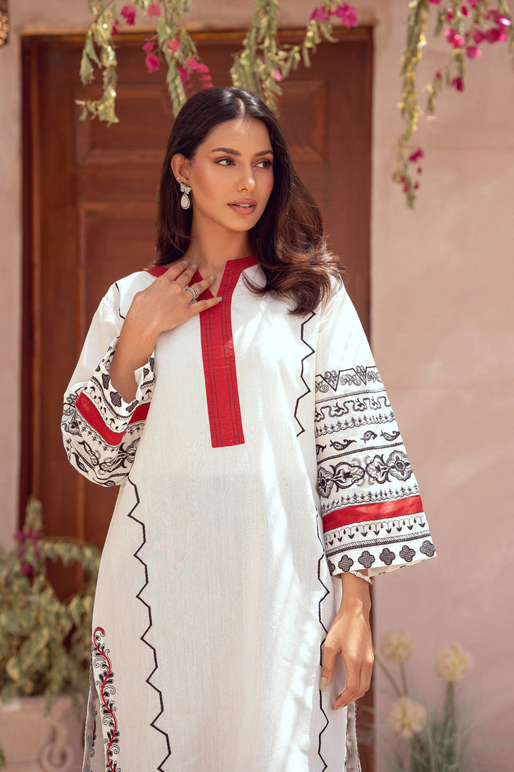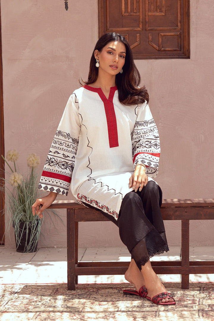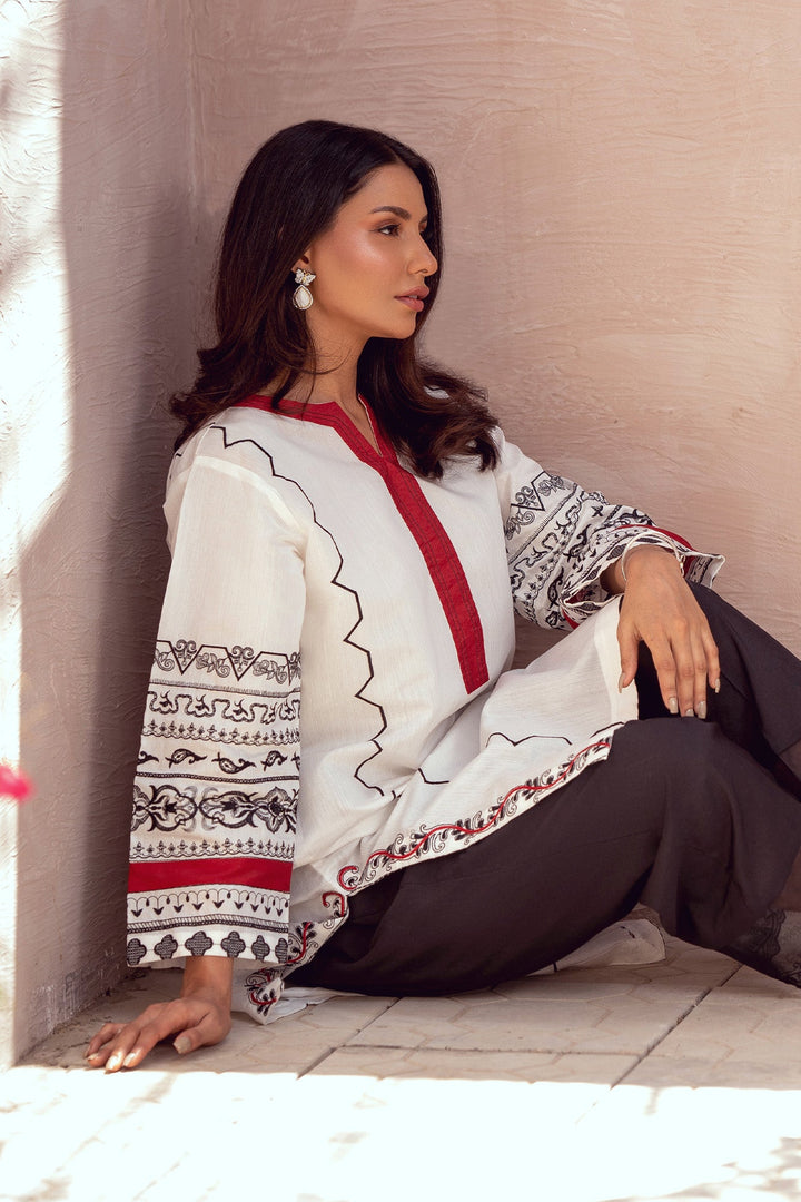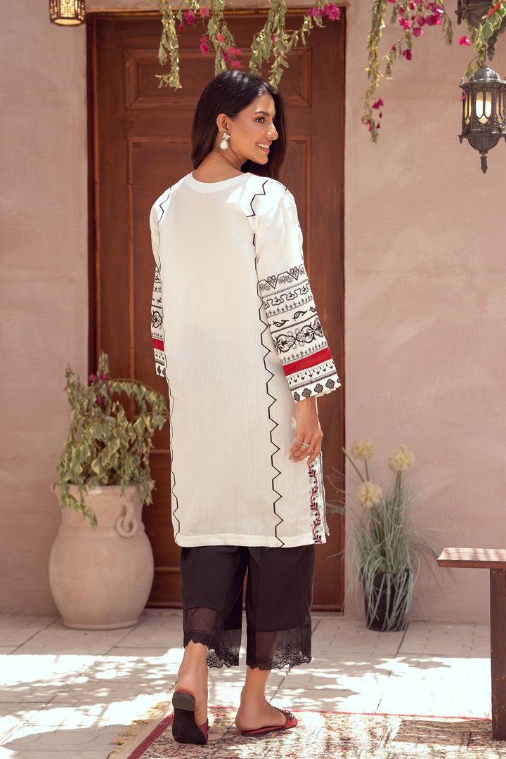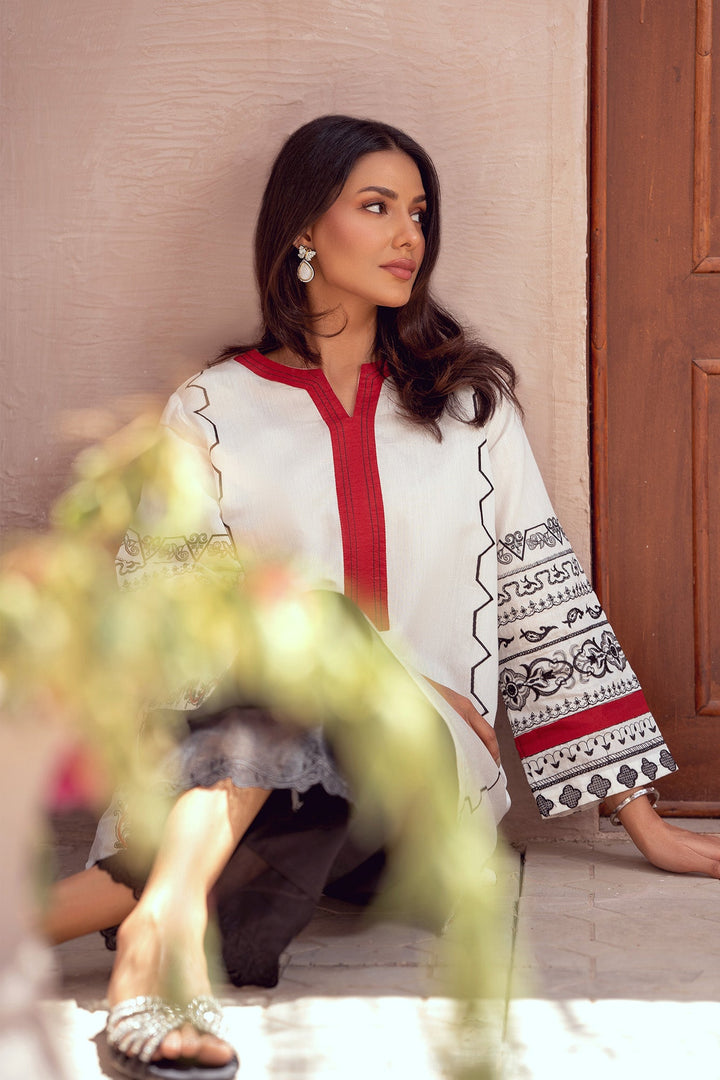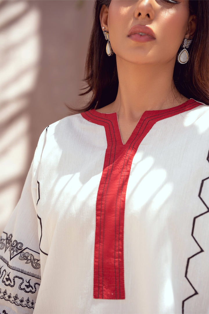 Meet Nimr, a timeless staple to add to your wardrobe. Our White Kurta features single satin embroidery on the sleeves and chalk for easy going elegance. Styled with our black crafted izaar, for an elevated look.