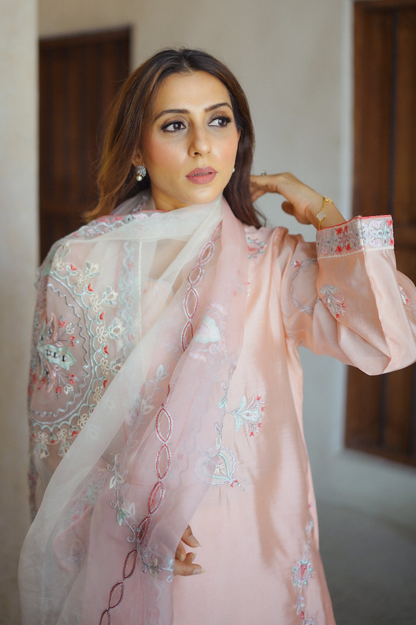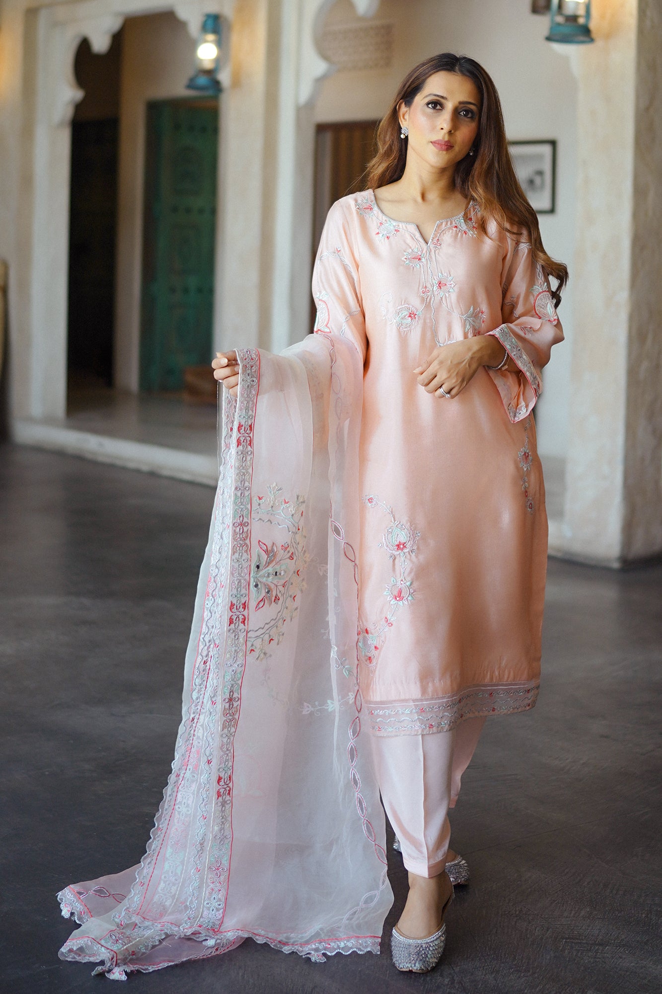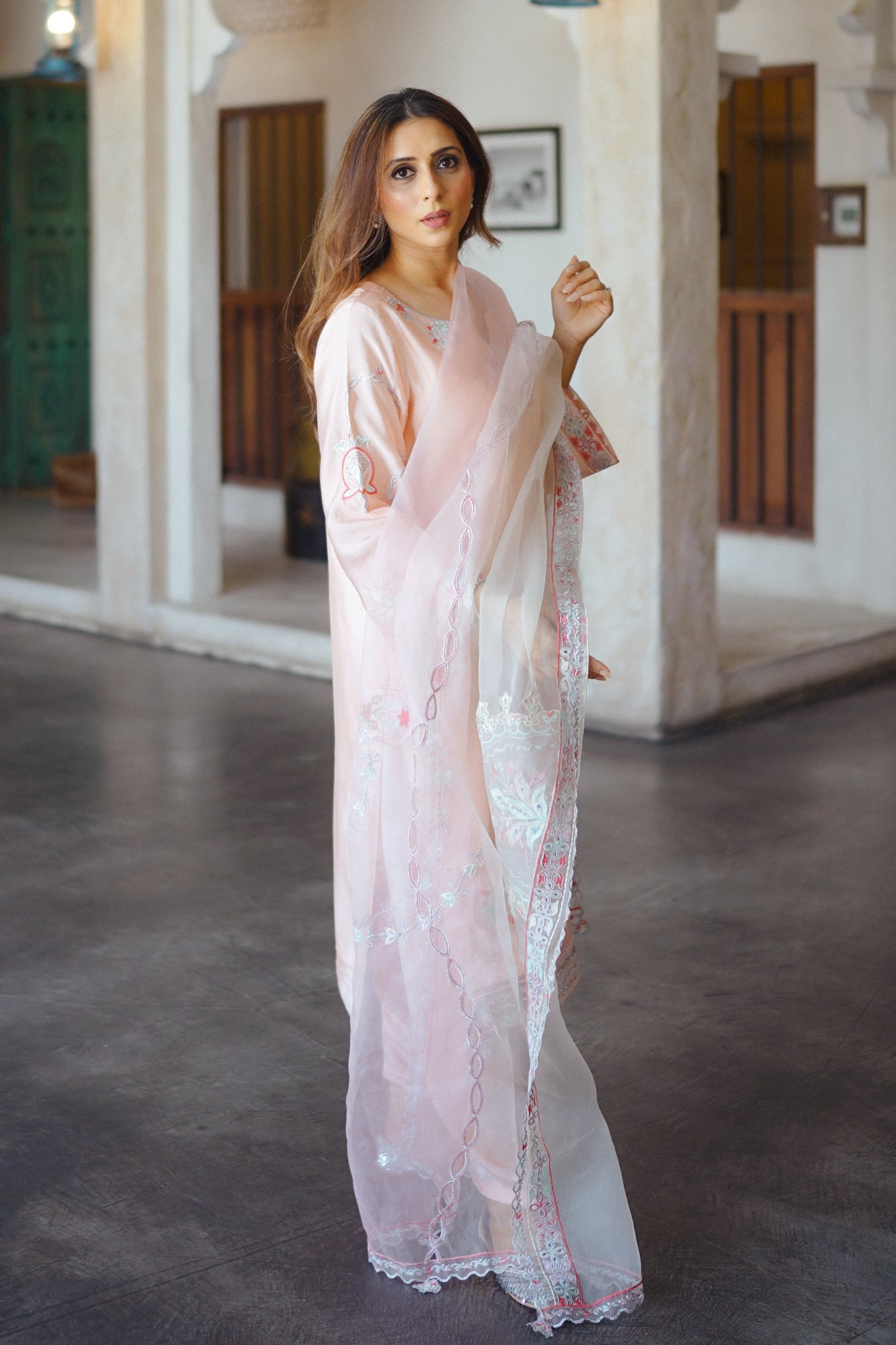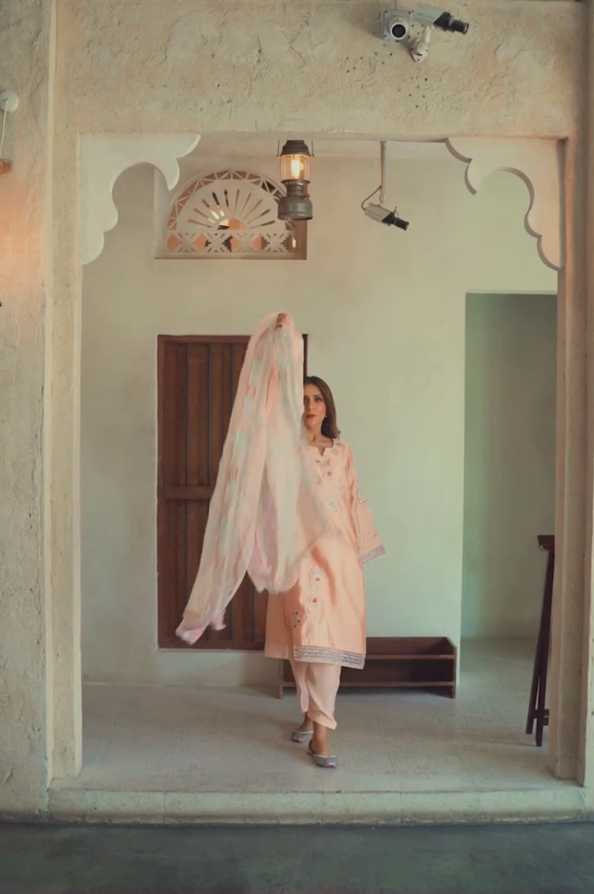 "Elevate your occasion with the exquisite charm of our Raya. Meticulously crafted with attention to detail, this dress exudes sophistication and timeless elegance. Adorned with intricate embroidery and delicate embellishments, each stitch tells a story of craftsmanship and luxury. The soft tea pink hue adds a touch of femininity, while the flowing silhouette ensures grace with every movement. Paired beautifully with a sheer organza dupatta that drapes effortlessly, this ensemble captures the essence of refined glamour. "