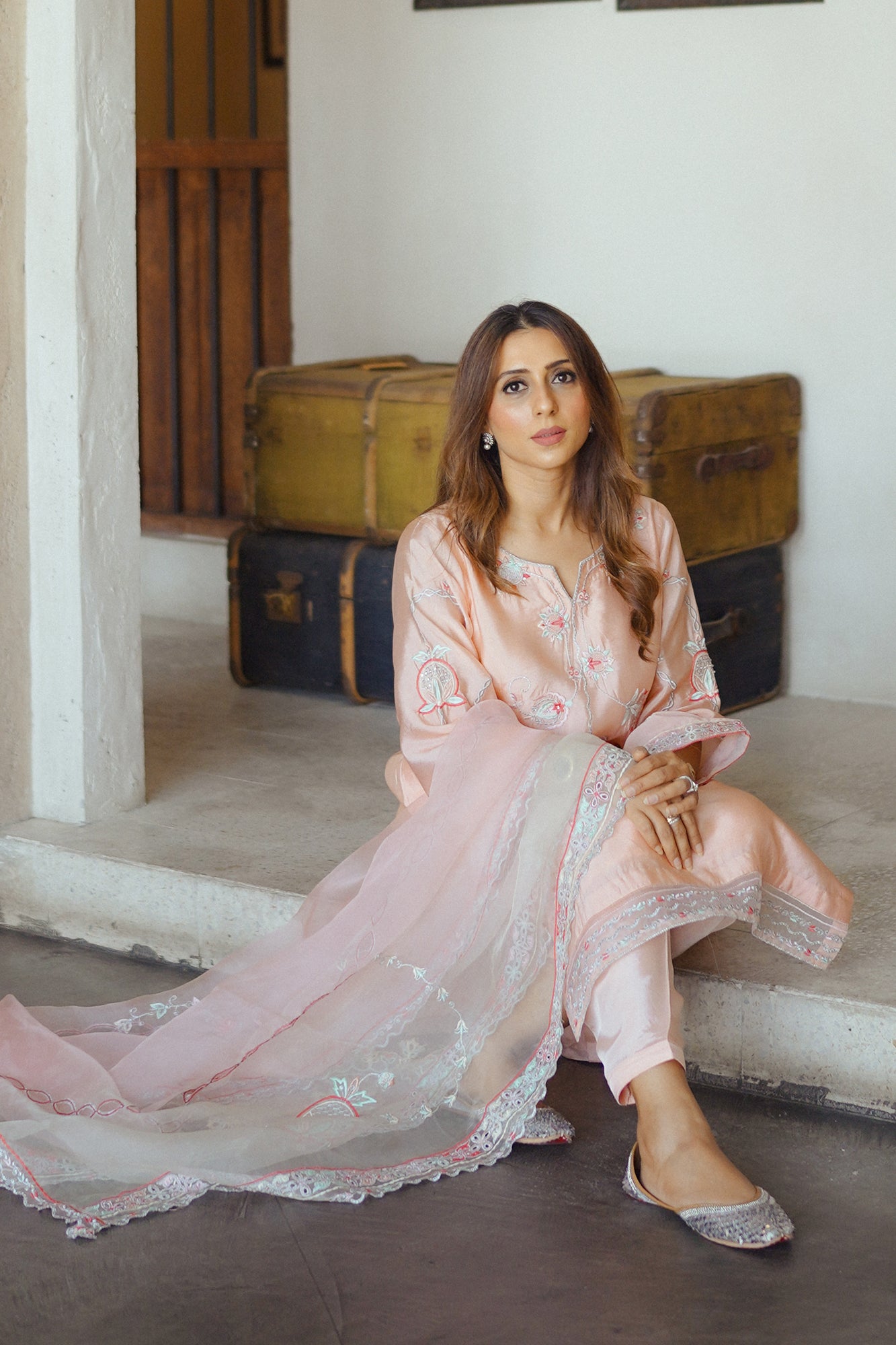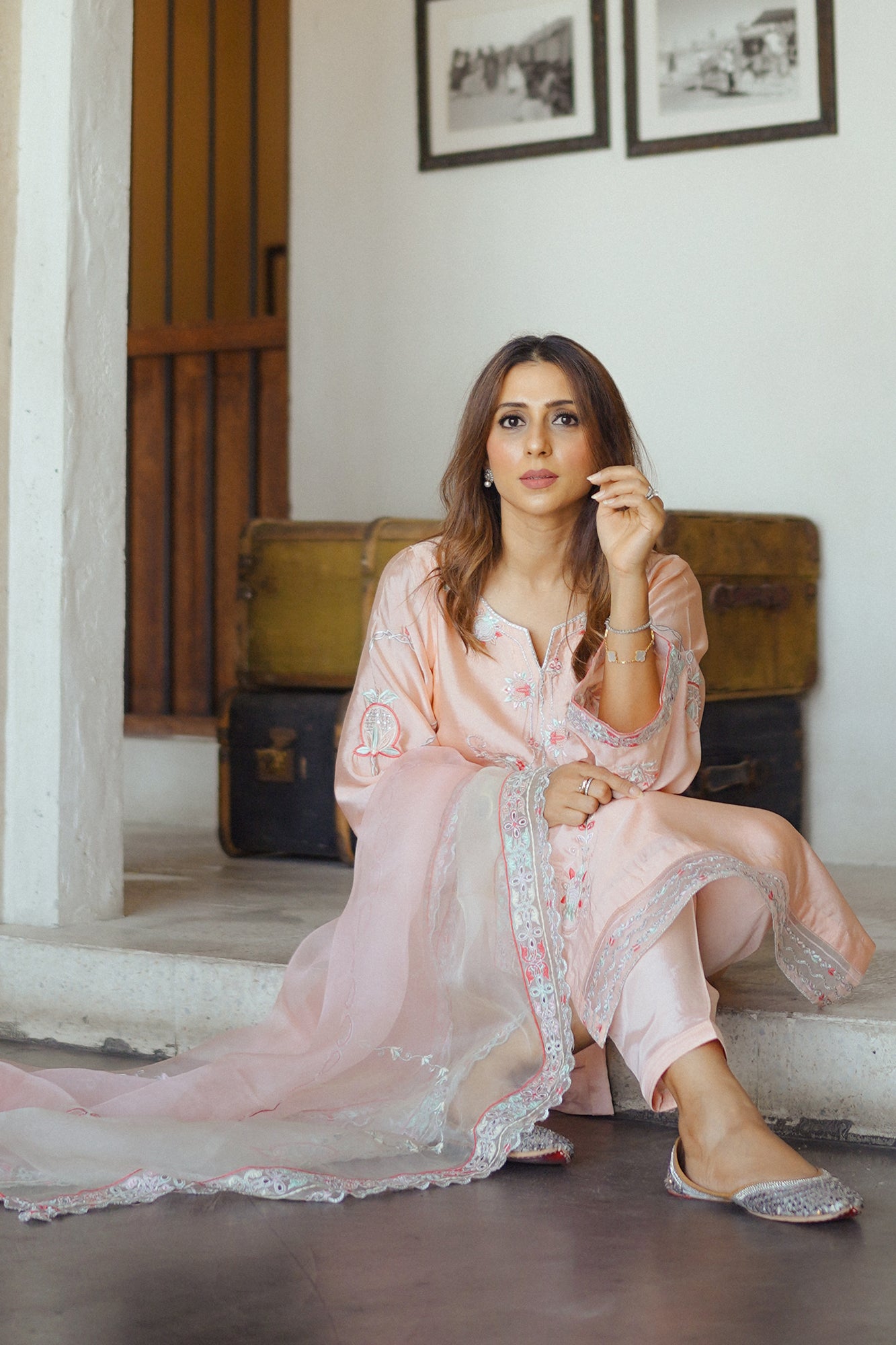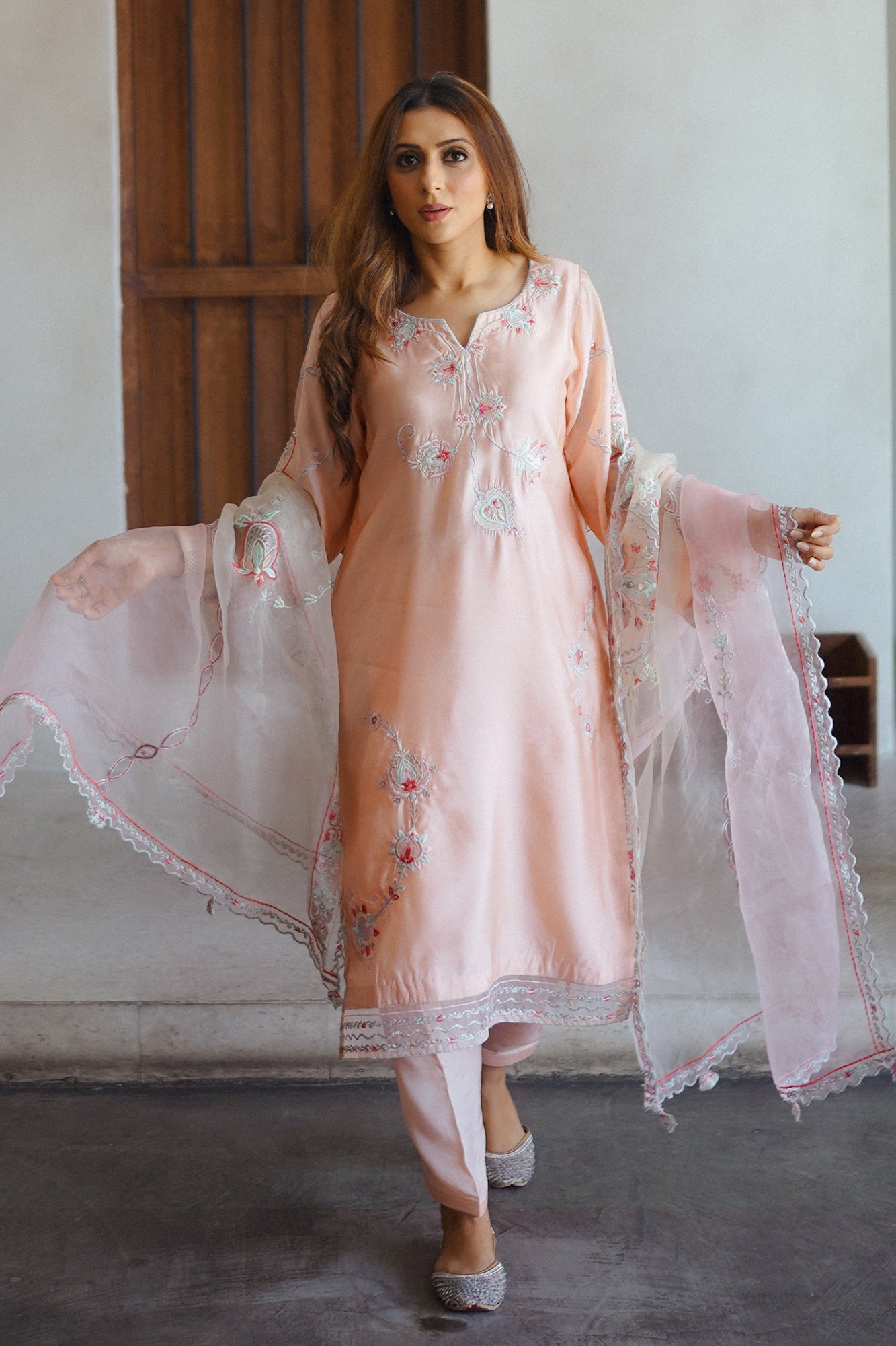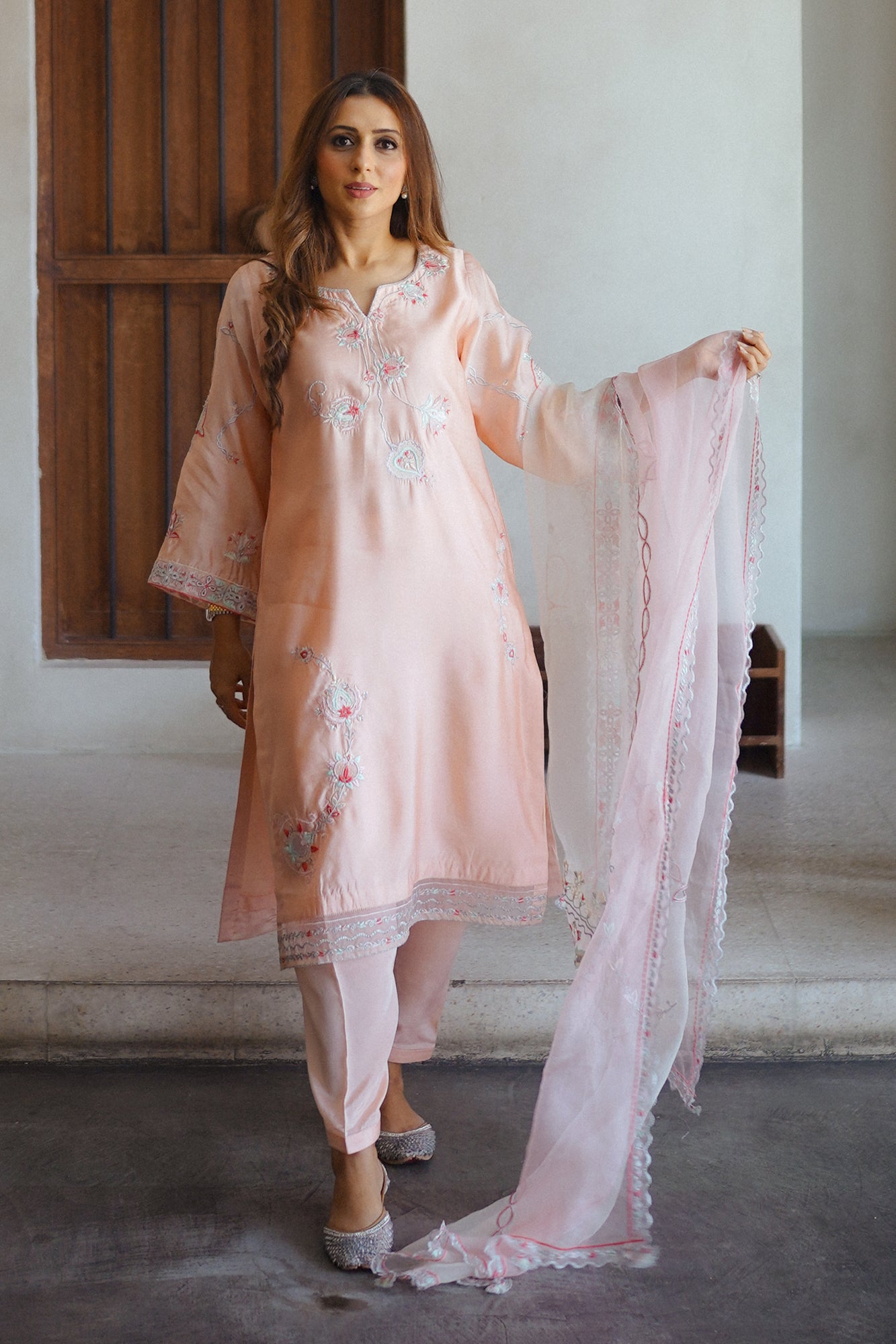 "Elevate your occasion with the exquisite charm of our Raya. Meticulously crafted with attention to detail, this dress exudes sophistication and timeless elegance. Adorned with intricate embroidery and delicate embellishments, each stitch tells a story of craftsmanship and luxury. The soft tea pink hue adds a touch of femininity, while the flowing silhouette ensures grace with every movement. Paired beautifully with a sheer organza dupatta that drapes effortlessly, this ensemble captures the essence of refined glamour. "