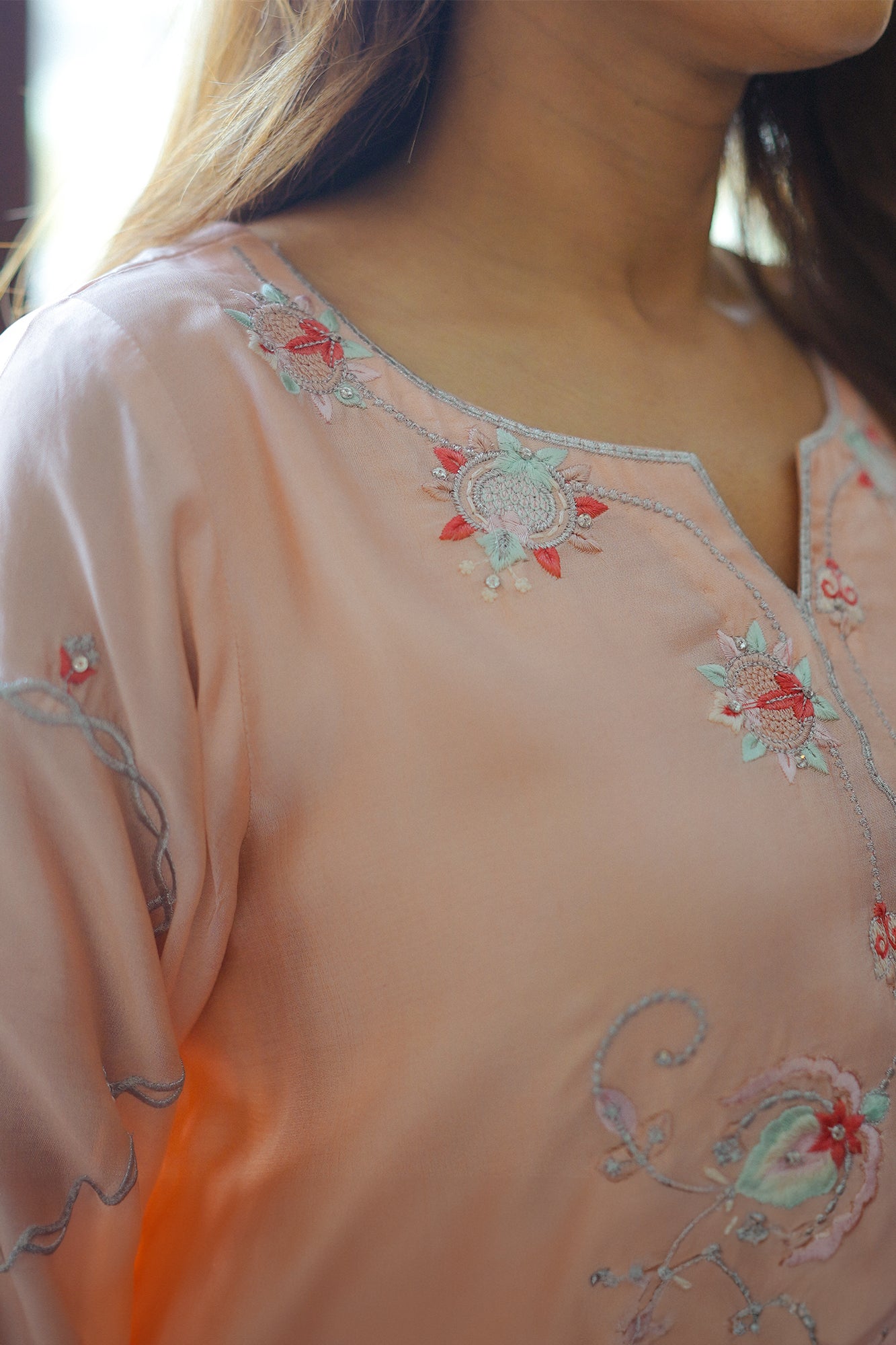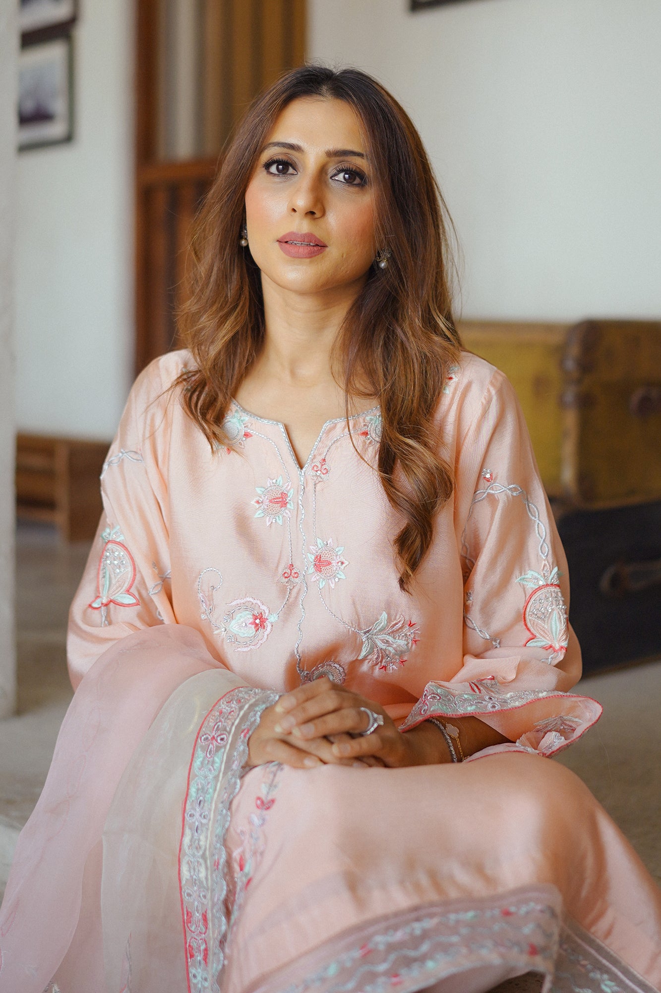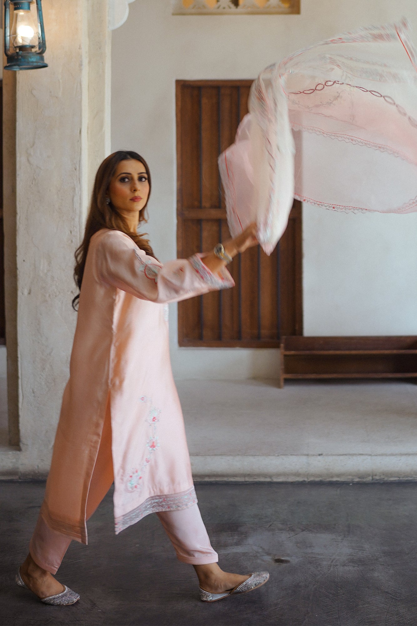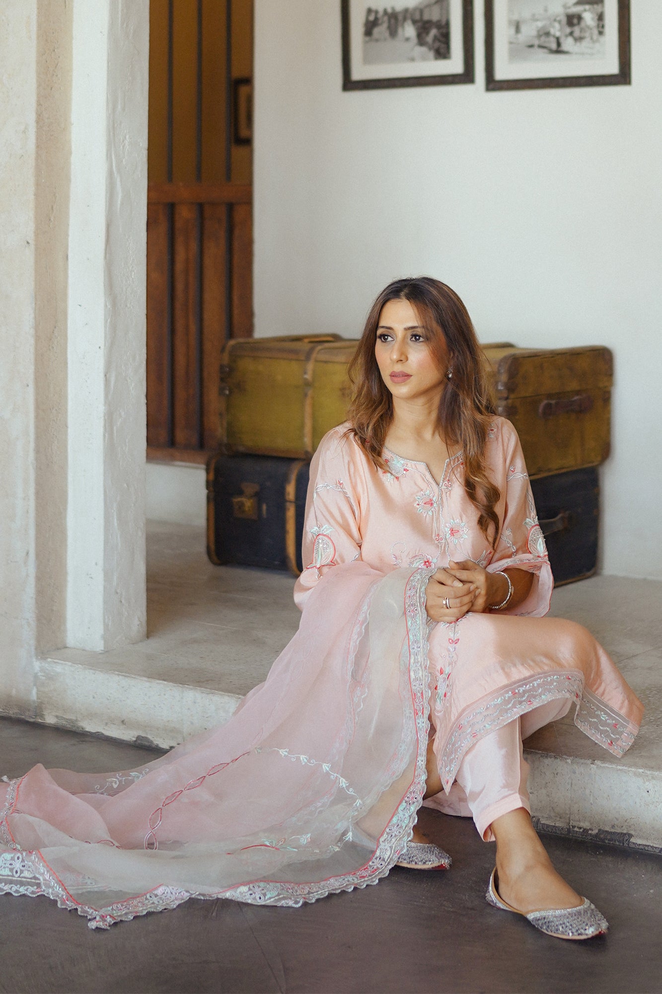 "Elevate your occasion with the exquisite charm of our Raya. Meticulously crafted with attention to detail, this dress exudes sophistication and timeless elegance. Adorned with intricate embroidery and delicate embellishments, each stitch tells a story of craftsmanship and luxury. The soft tea pink hue adds a touch of femininity, while the flowing silhouette ensures grace with every movement. Paired beautifully with a sheer organza dupatta that drapes effortlessly, this ensemble captures the essence of refined glamour. "