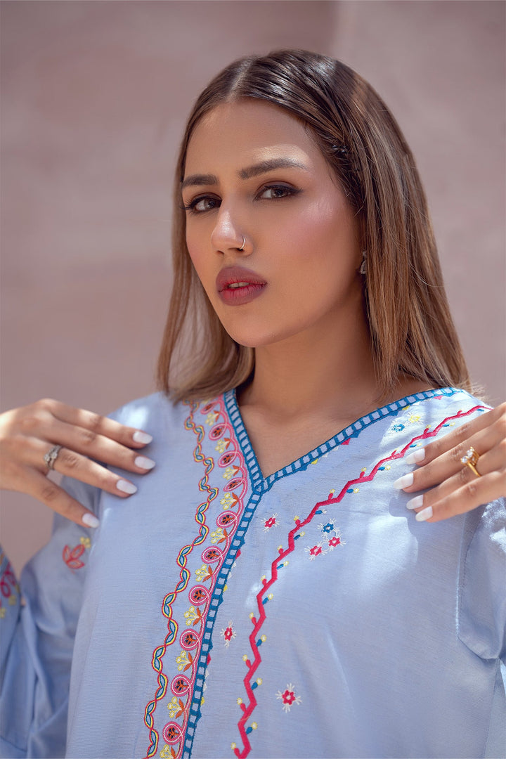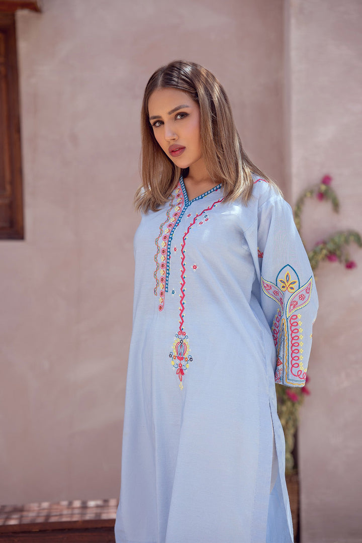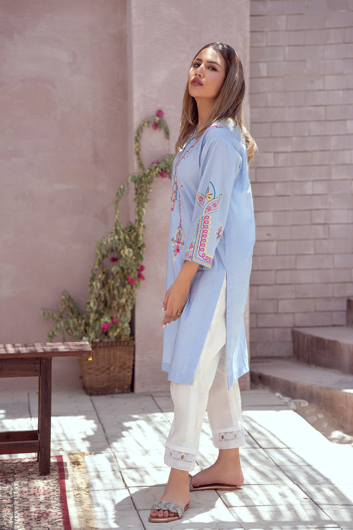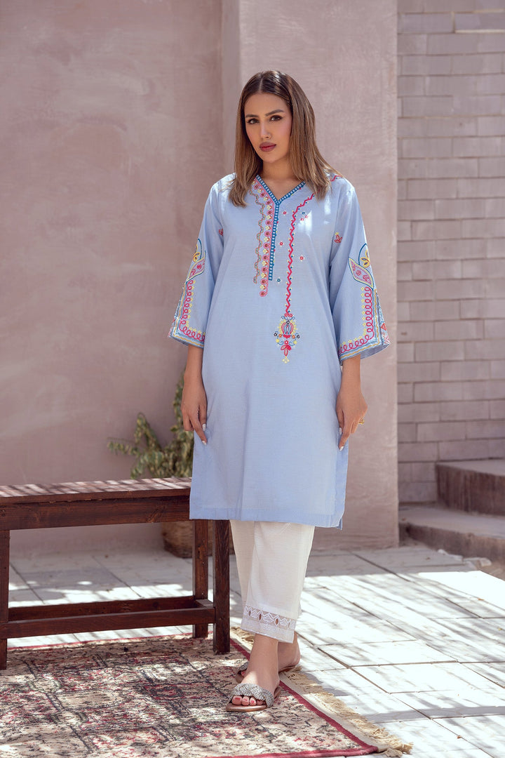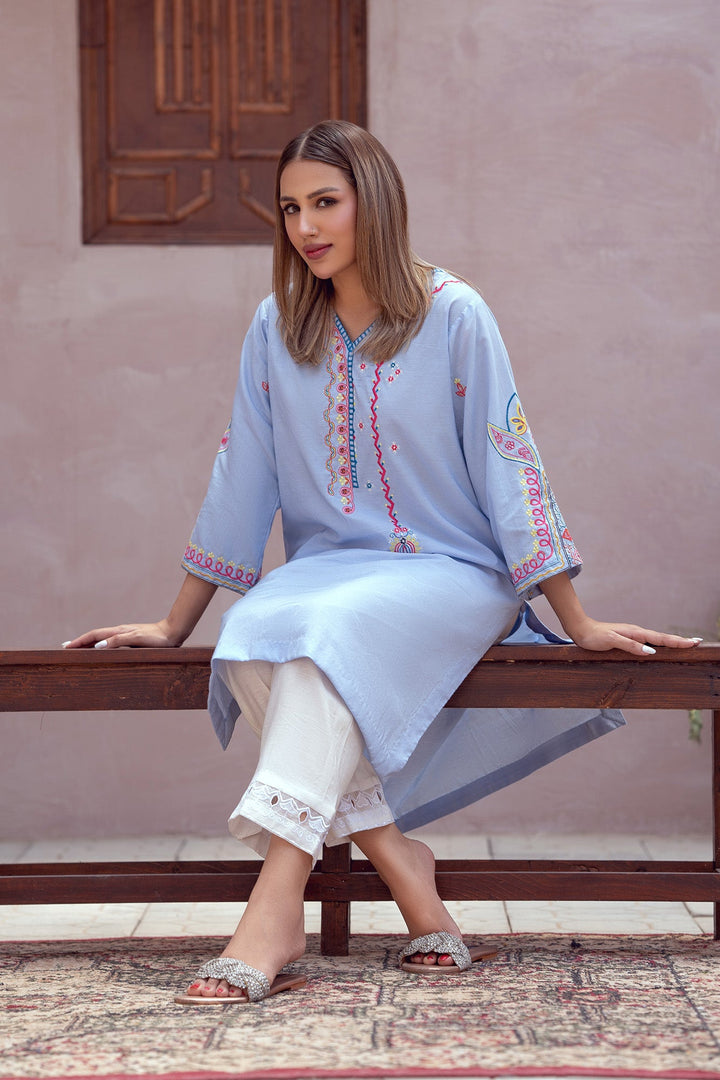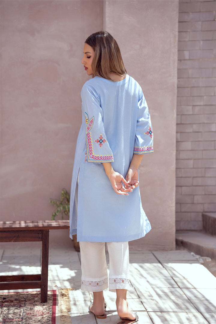 Our Soha Kurta in Coral Blue is a must have for summer occasions. Crafted in cotton, it features embroidery stitches...