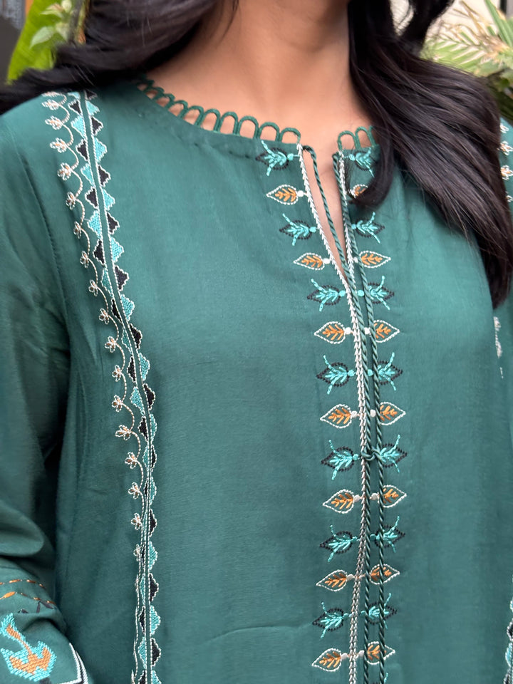 A timeless statement in emerald green Khaadi silk, Tiana embodies sophistication and serenity. Delicate thread embroidery dances across the shirt...
