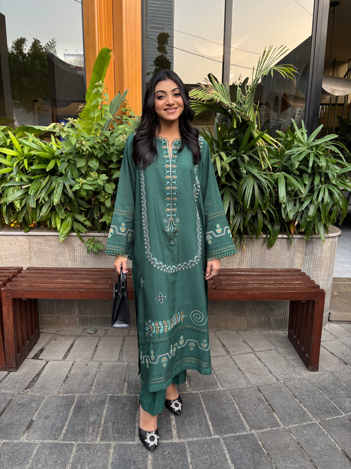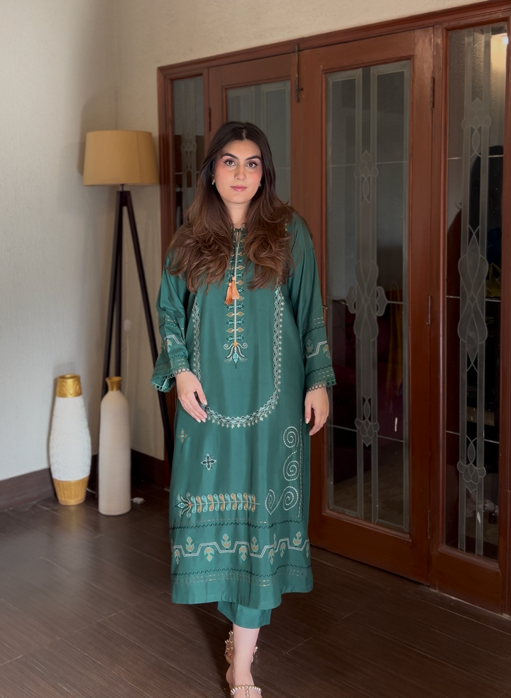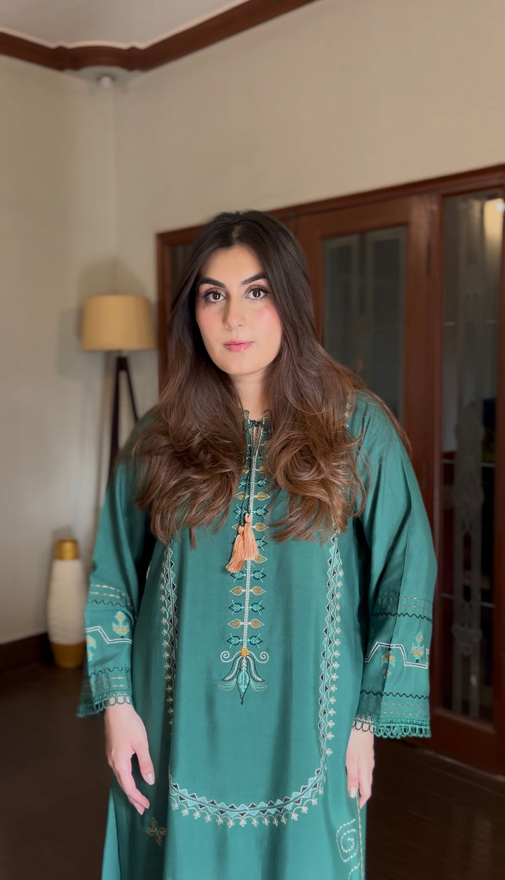 A timeless statement in emerald green Khaadi silk, Tiana embodies sophistication and serenity. Delicate thread embroidery dances across the shirt and sleeves, while ornate dori tassels accent the neckline with charm. Paired with matching silk trousers, this ensemble redefines understated luxury — confident, composed, and effortlessly graceful.