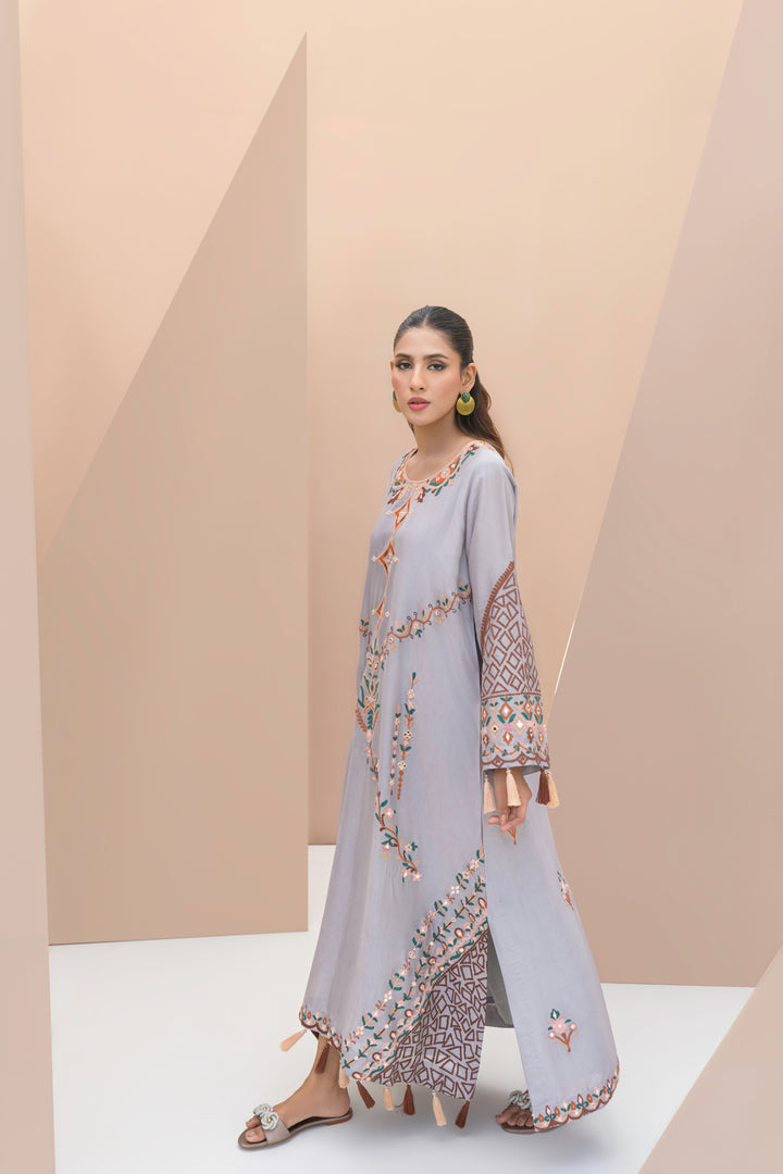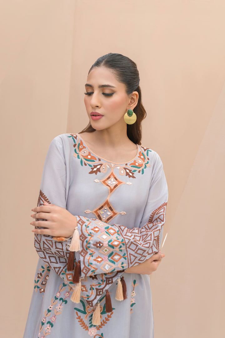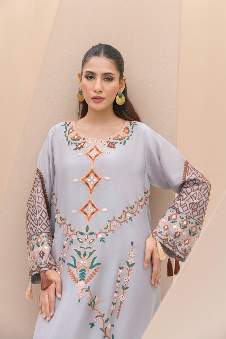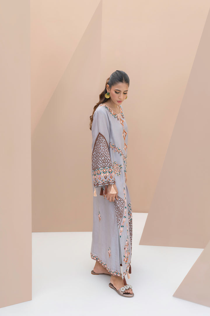 Virsah captures the joy of celebration — multicolored ari embroidery and mirror accents on luminous Sheesha silk bring vibrance and movement. With tassels at the sleeve adding flair,