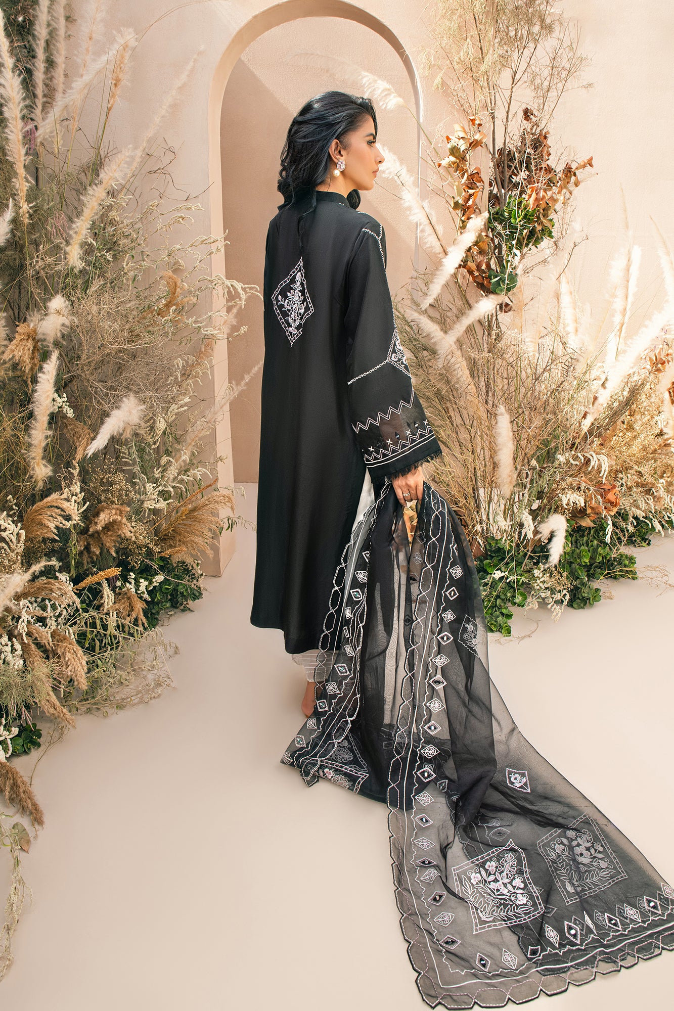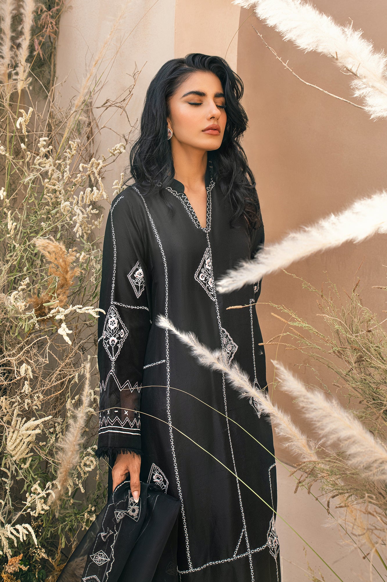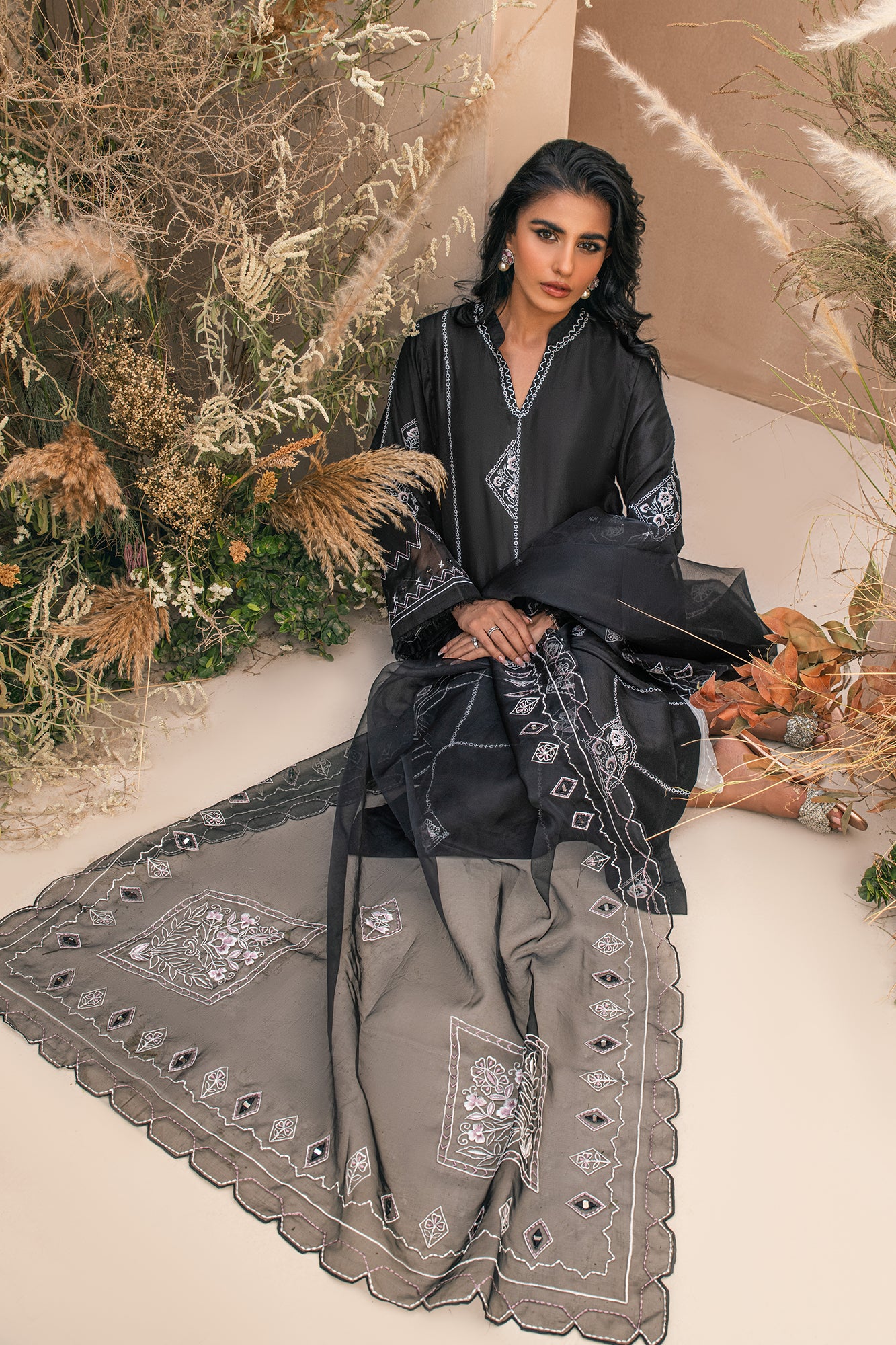 Meet "Zebaish" from Rang - e - Khizan, a masterpiece in Raven Black. The fusion of Shisha silk and organza, adorned with meticulous embroidery, showcases an exquisite balance of tradition and modernity. Let Zebaish's allure captivate you and redefine your style with sophistication.